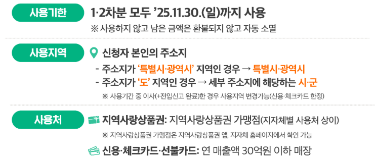 모든 소비쿠폰은 2025년 11월 30일까지 사용해야 하며, 기간 내 사용하지 않은 잔액은 환수됩니다. 미리 계획적으로 사용하는 것이 좋습니다.