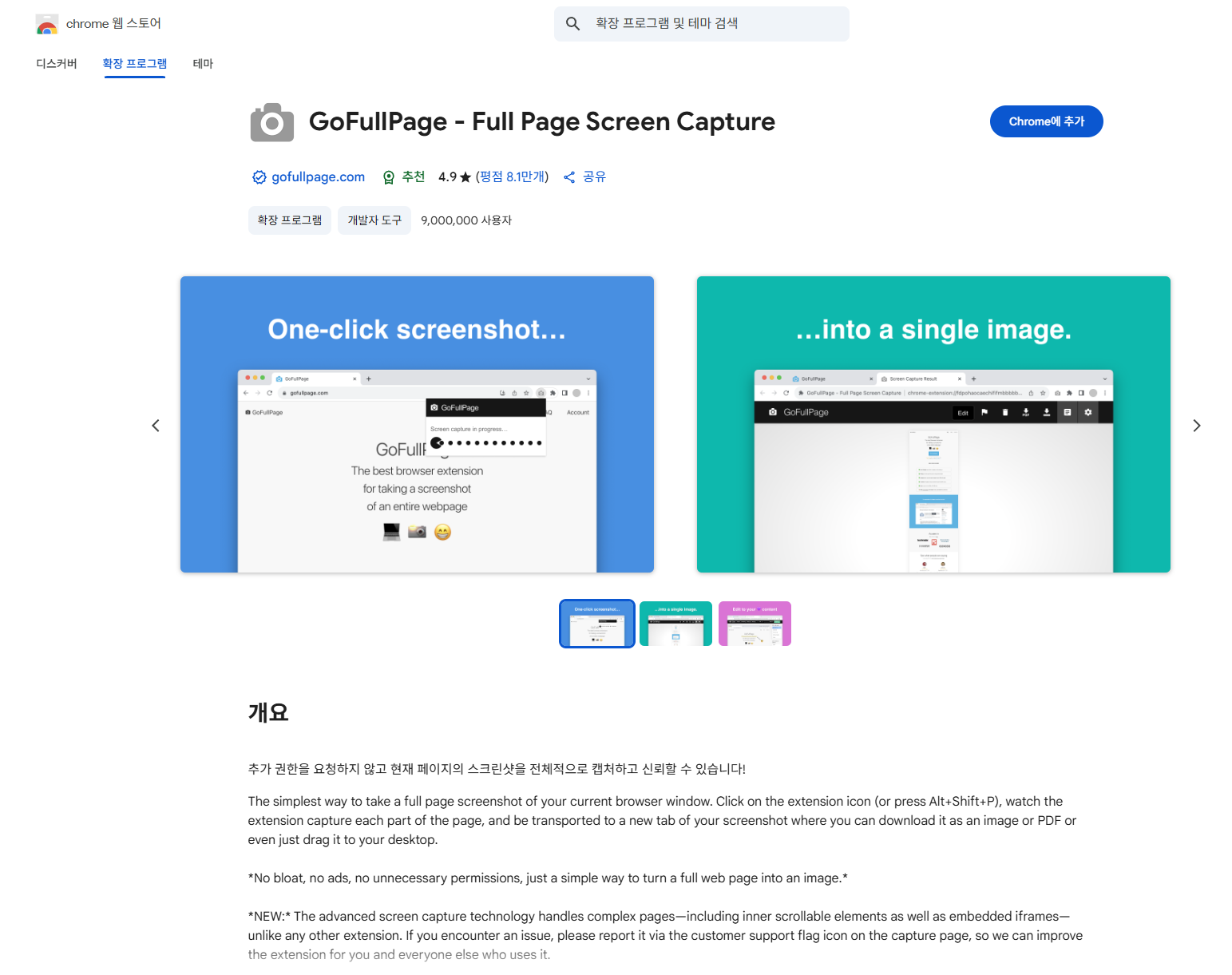 크롬 웹 스토어 상단 검색창에 “GoFullPage” 또는 “Full Page Screen Capture”를 입력합니다. 검색 결과에서 “GoFullPage - Full Page Screen Capture”라는 확장 프로그램을 선택합니다.