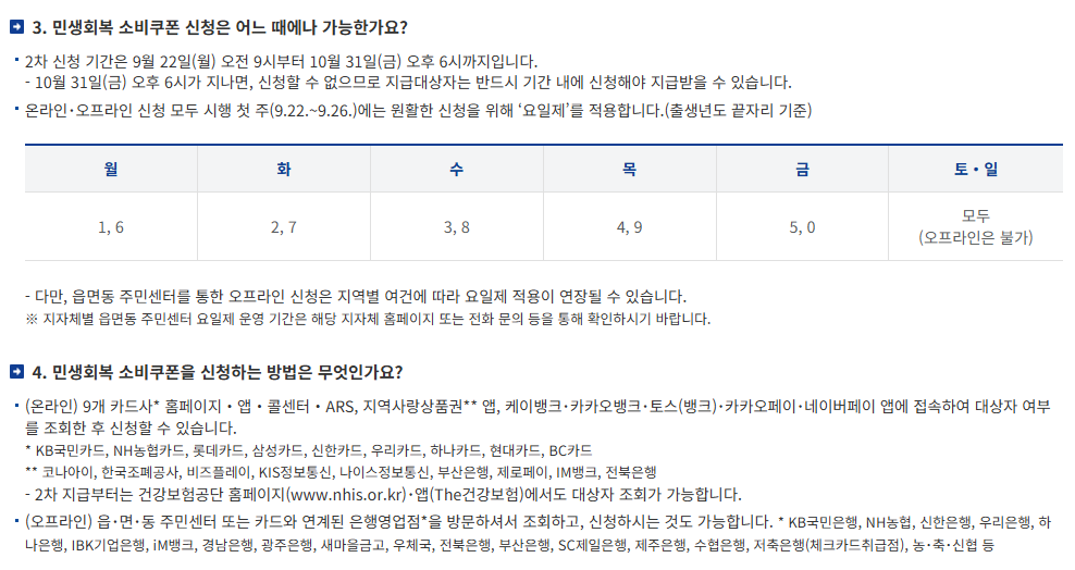 신청은 2025년 9월 22일(월)부터 10월 31일(금)까지 가능합니다. 시행 첫 주(9월 22일~26일)는 출생연도 끝자리에 따른 요일제(월요일: 1,6 / 화요일: 2,7 등)를 운영해 혼잡을 방지합니다. 주말에는 모든 대상자가 신청할 수 있습니다.