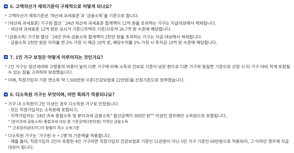 소득 상위 10%와 고액 자산가는 제외됩니다. 고액 자산가 기준은 2024년 재산세 과세표준 합계가 12억 원을 초과하거나, 2024년 금융소득 합계가 2천만 원을 초과하는 경우입니다. 소득 기준은 가구별 2025년 6월 건강보험료 본인부담금 합산액(장기요양보험료 제외)으로 판단하며, 가구원 수와 가입 형태에 따라 다릅니다. 예를 들어, 1인 가구는 약 220,000원 이하, 4인 가구 직장가입자는 510,000원 이하입니다. 다소득원 가구(직장가입자 2인 이상 등)는 가구원 수를 1명 추가한 기준을 적용해 형평성을 고려합니다.