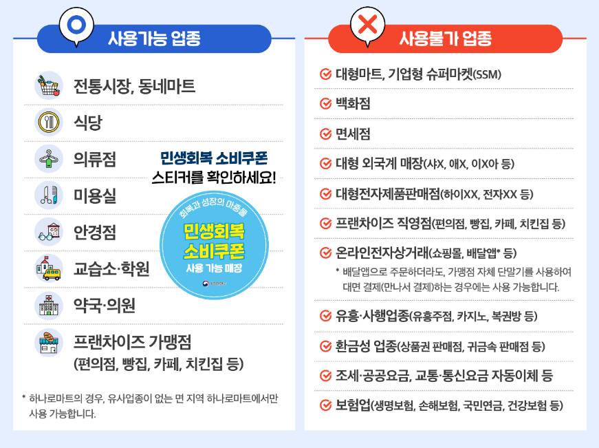 - 불가능: 대형마트, 백화점, 기업형 슈퍼마켓, 배달앱, 유흥업소, 온라인 쇼핑몰.