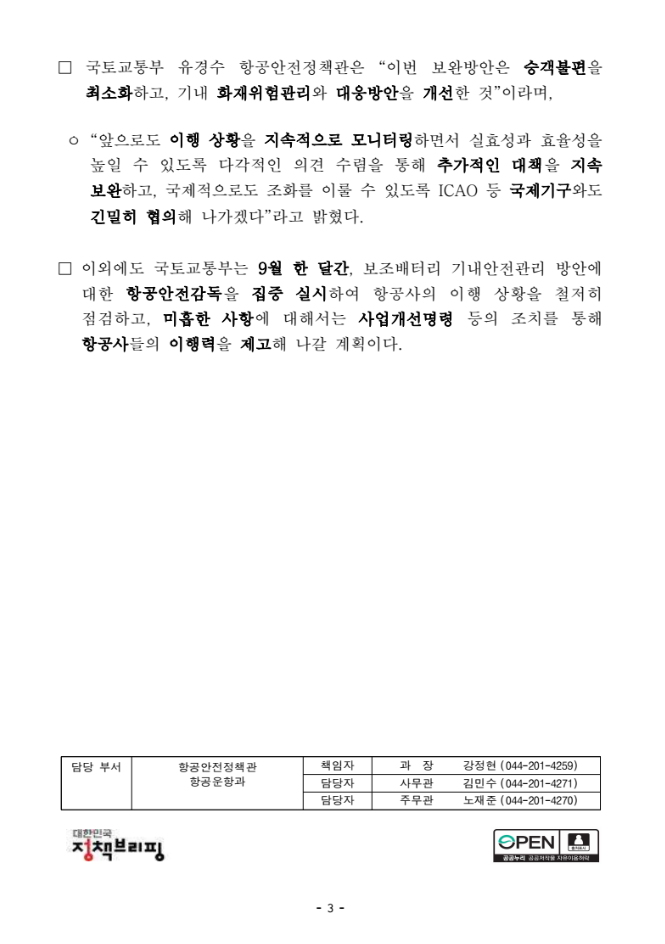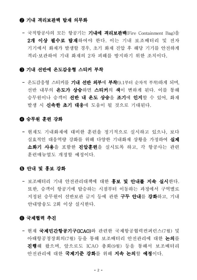 전자제품 과열로 인한 화재를 방지하기 위해 승객은 기내에서 전자제품 사용 시 주의가 필요합니다. 충전 중 과열이 의심되면 즉시 사용을 중단하고 승무원에게 보고하세요. 국제선 이용 시 목적지 국가 규정도 확인하는 습관을 들이시기 바랍니다. 예를 들어, 일본이나 미국도 비슷한 기준을 따르지만 세부 사항이 다를 수 있습니다.