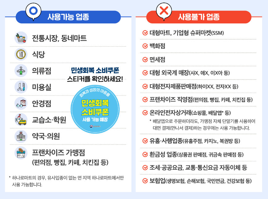 - 사용 불가 업종: 대형마트, 백화점, 프랜차이즈 직영점(예: 스타벅스), 대형 전자제품 매장, 온라인 쇼핑몰, 배달앱, 키오스크 결제, 유흥업소, 면세점, 공공요금, 보험료, 상품권 구매 등