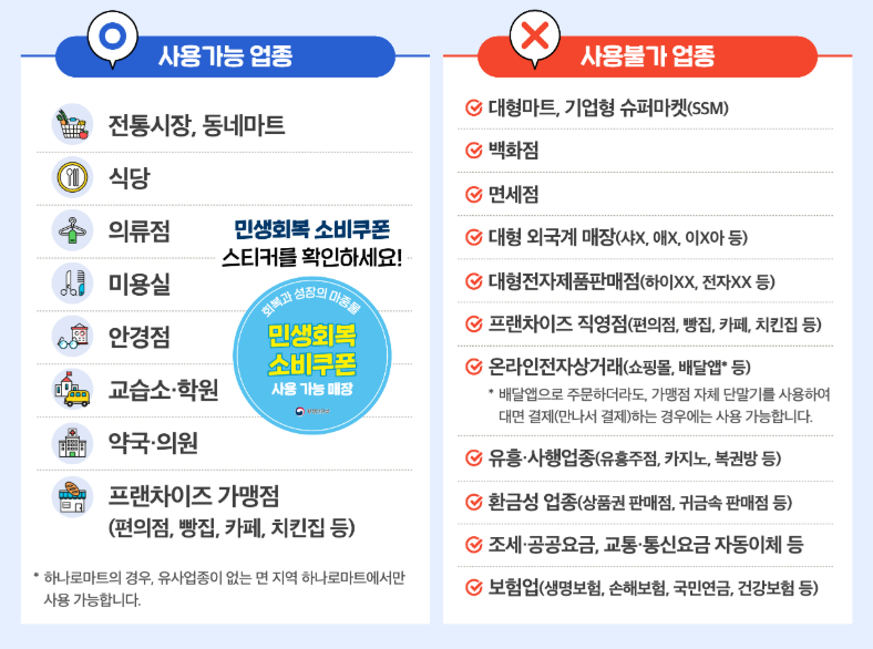 민생회복 소비쿠폰은 지역 소상공인 지원을 목표로 하므로, 아래 업종에서는 사용할 수 없습니다: